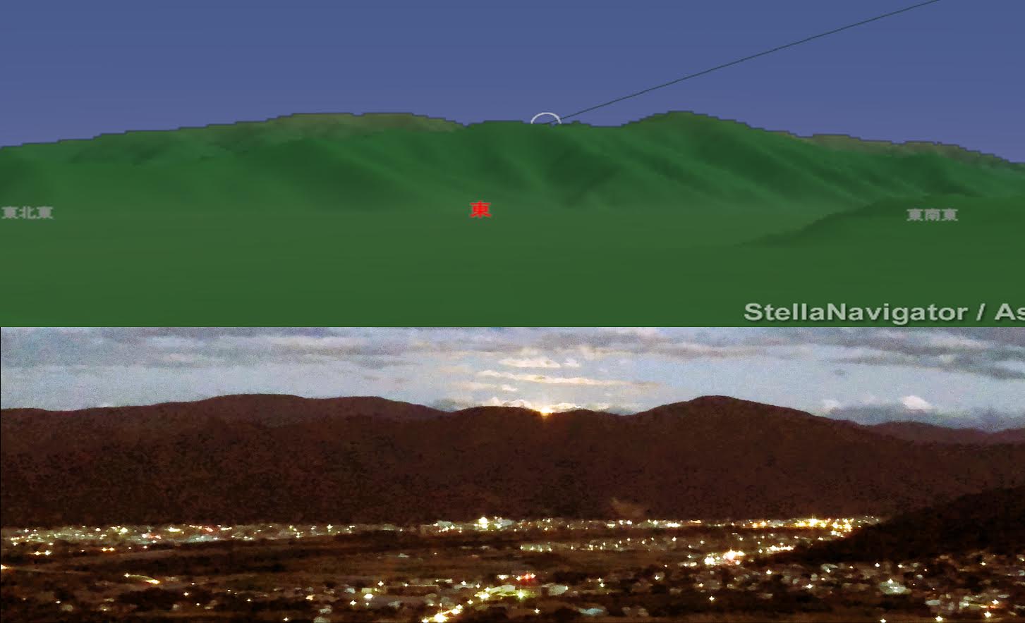 そのときの予想スライド画像と月の出の実写を組み合わせた写真を、渡邊さんが送ってくれました。自分がいる場所から、月がどこに何時何分に出てくるか特定できるのです。