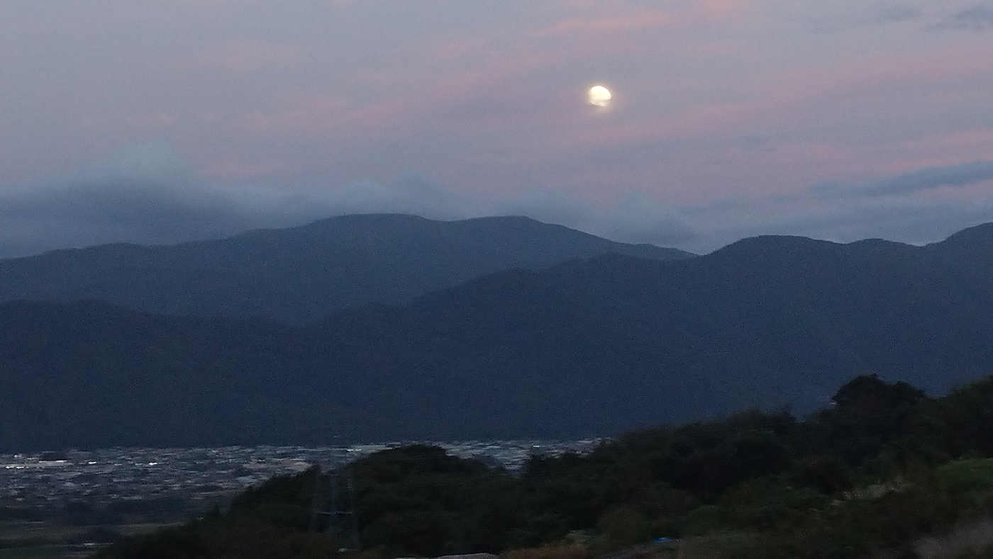 姿を見せ始める予測時刻の午後5時15分ごろは、うっすらと細い雲がなびき、月の出は見られませんでしたが、同20分ごろ、その細い薄雲の中に、大きな円い輪郭があるのに気づきました。日の入り直後でまだ太陽の光りが十分に空にある時間帯だっただめでしょう、それは餅のような白さで、月です。とても大きく見えます。その場所は、確かに天文アプリが予測した鏡台山の南峯の辺りから上る軌道上(約60度の角度で右上に上昇)です。