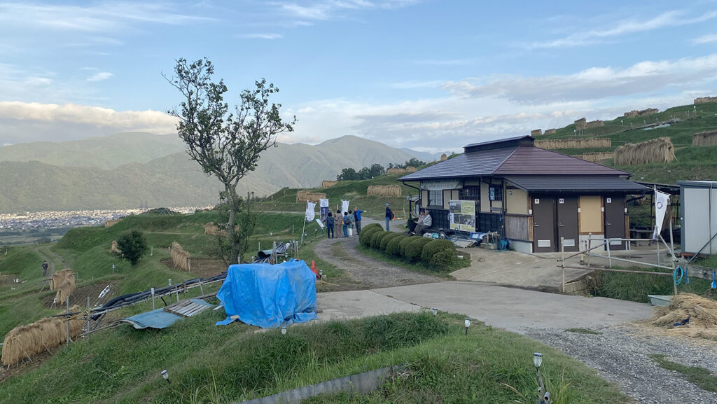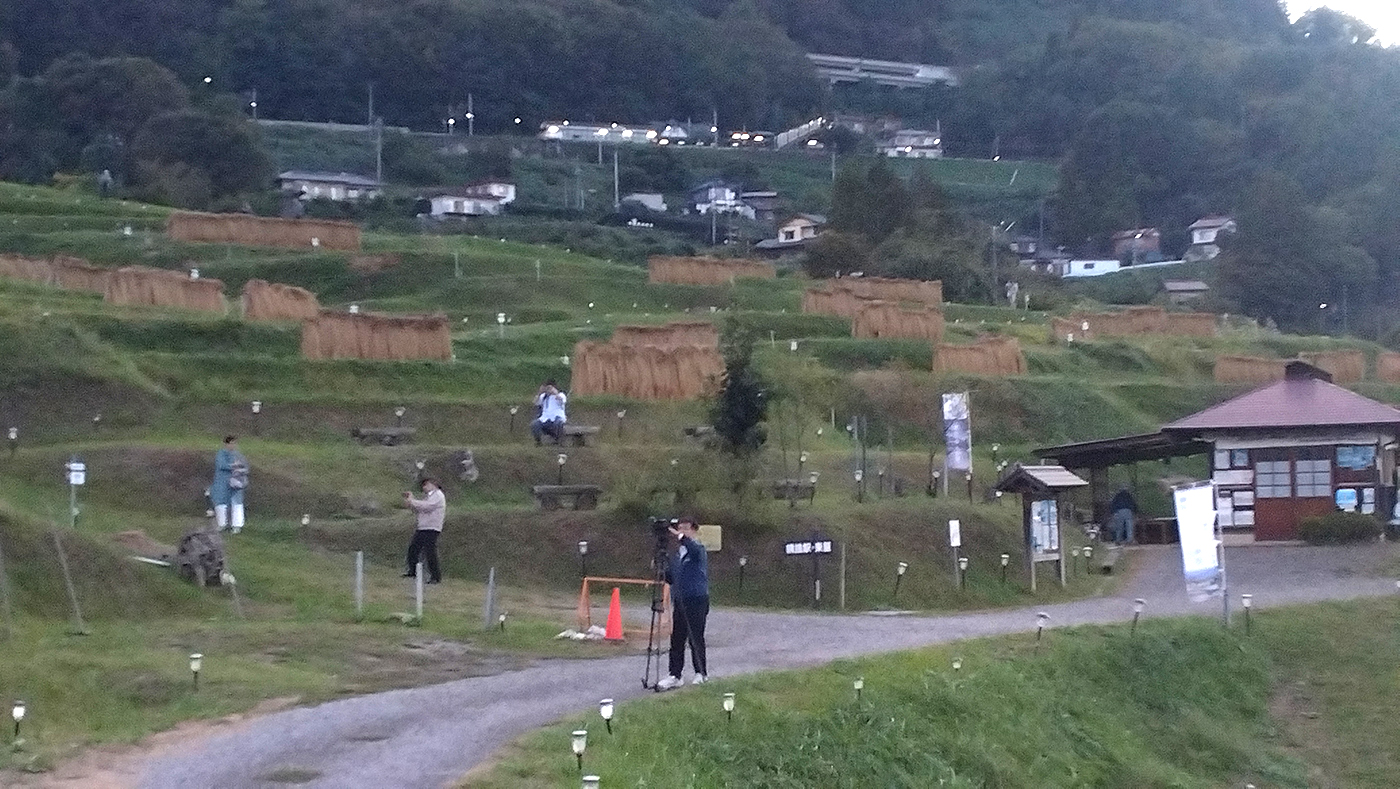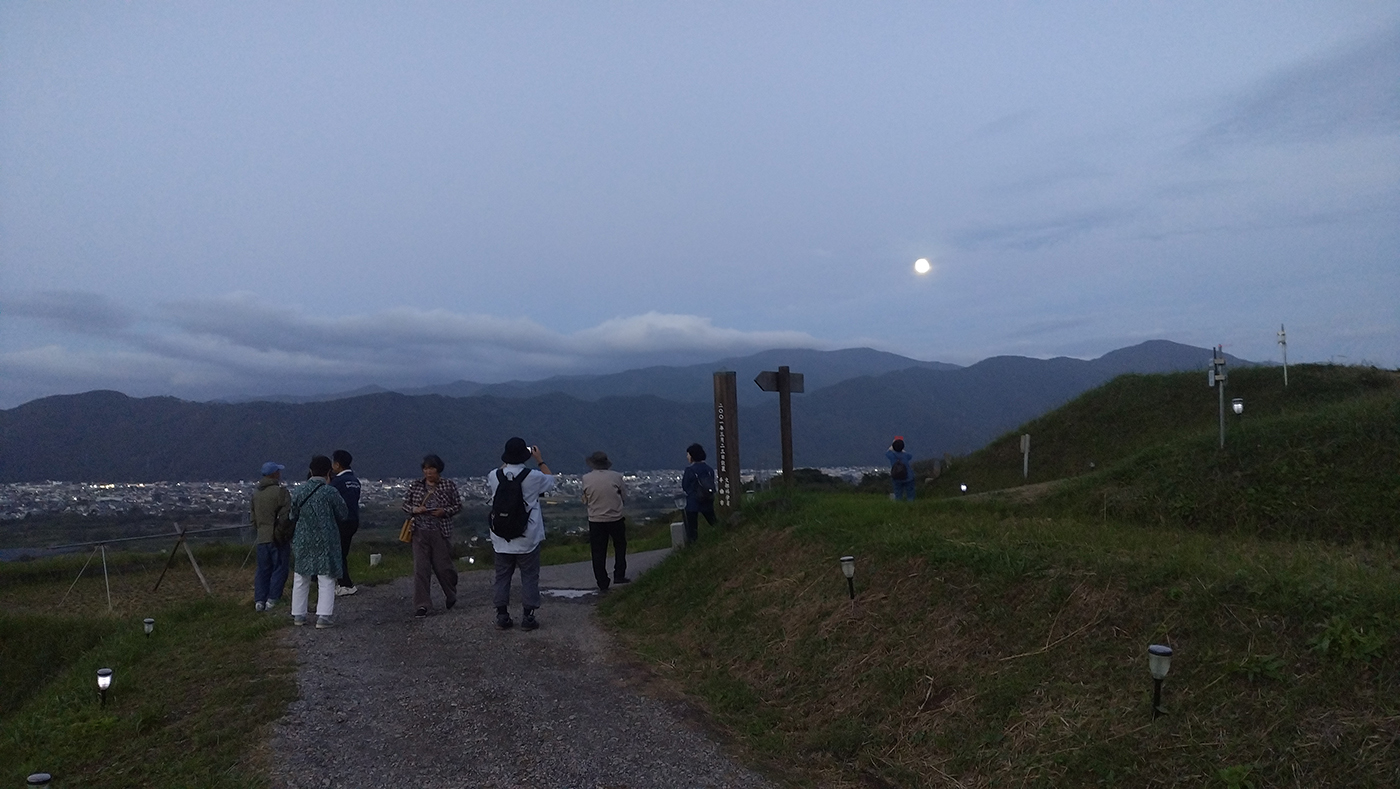 千曲市日本遺産推進協議会とさらしなルネサンスは中秋の10月6日、天文アプリが示すシミュレーション通りに中秋の名月が山の峯に現れるかどうか確かめるイベントを「姨捨の棚田」の一角にある姪石苑(めいしえん)で行いました。