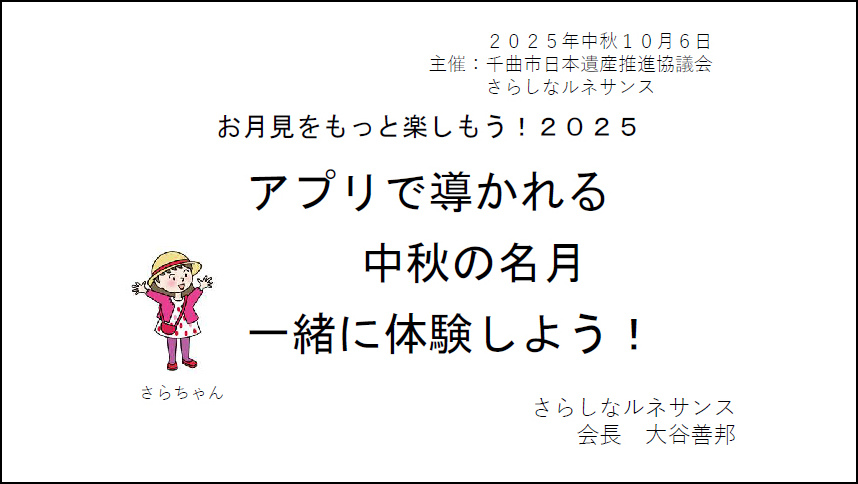 姪石苑での観月の前には、千曲市日本遺産センターで天文アプリの「ステラナビゲーター12」の画面をパソコンからスクリーンに映し出し、どのように操作すれば、事前に中秋の名月の現れる山の峯と時刻が分かるかを解説しました。このアプリを使うと、過去未來、世界のどこの場所でも中秋の名月の現われる様子を映し出すことができます。松尾芭蕉が「更科紀行」の旅で見た月の出、さらに北極で見られる中秋の名月もご覧いただきました。現代の「月の都」さらしな姨捨で最も有名な「鏡台山の凹んだ峯」から上がる中秋の名月は、どこでなら見られるのかについても、この天文アプリなどを使えば分かることをお伝えしました。(さらしなルネサンス・大谷善邦)