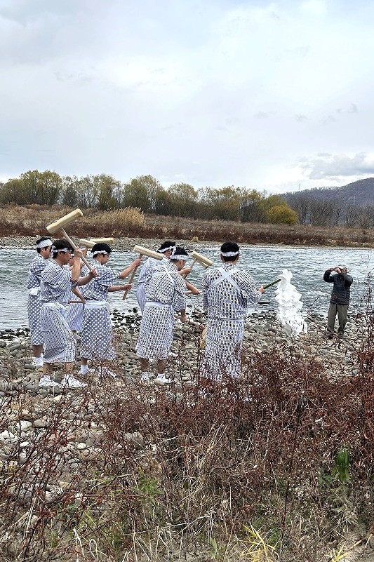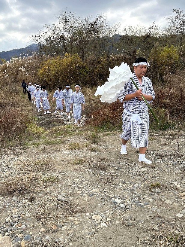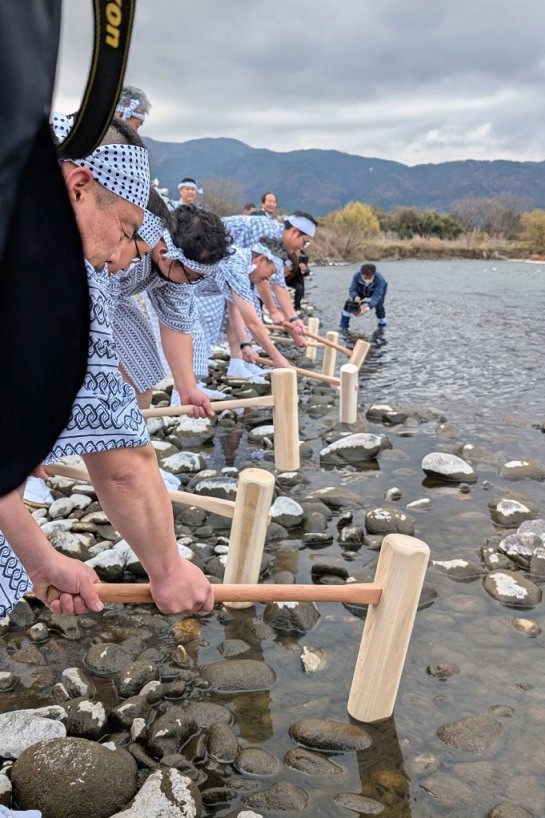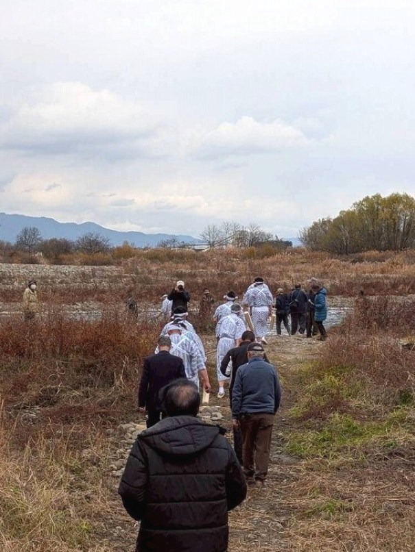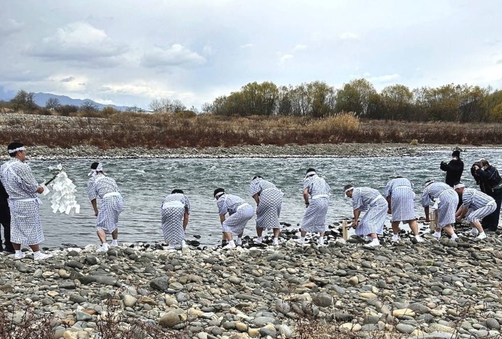 千曲川河原で禊を行う餅つきトウドの皆さん。