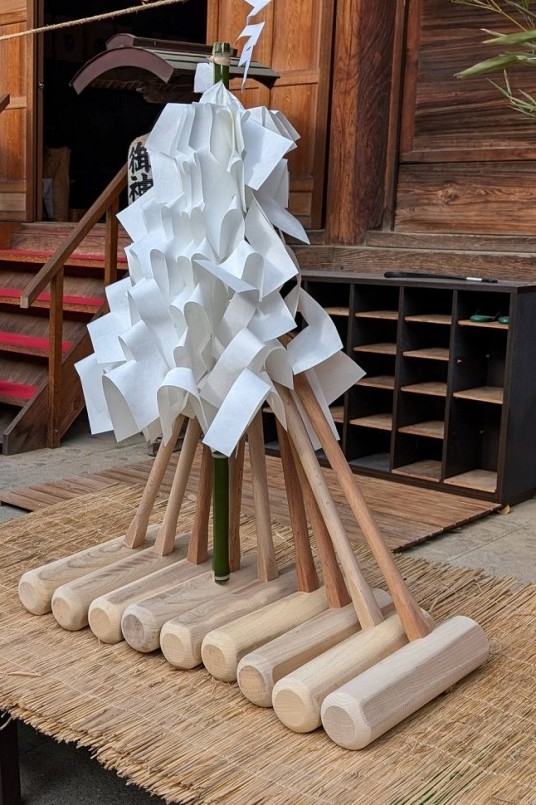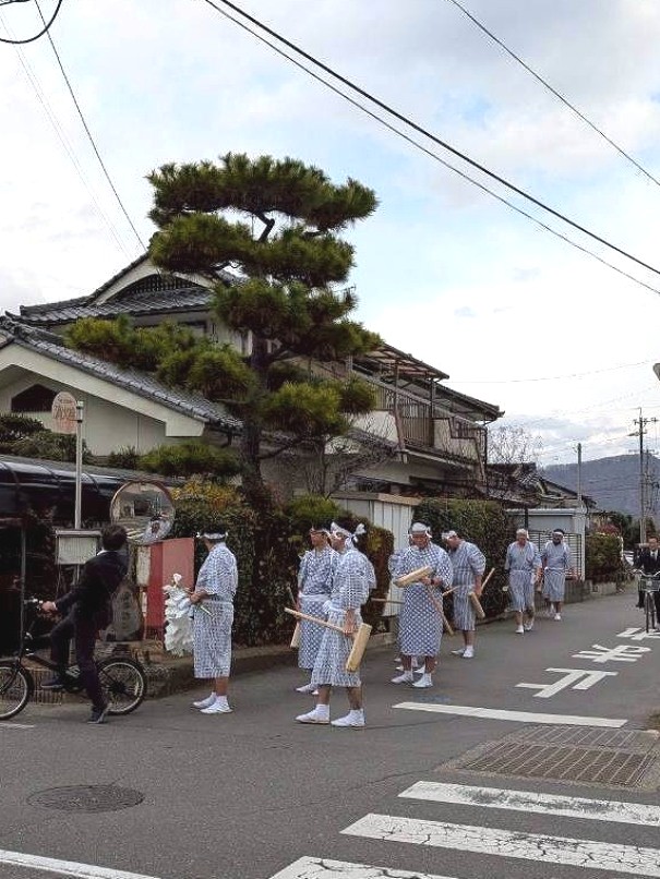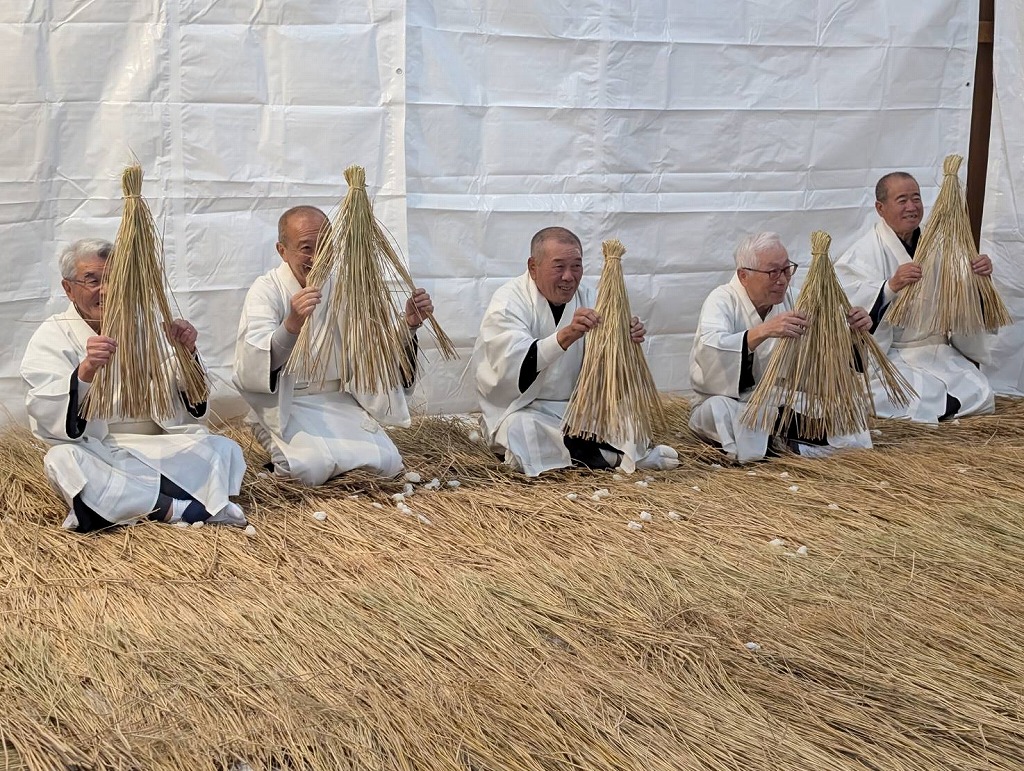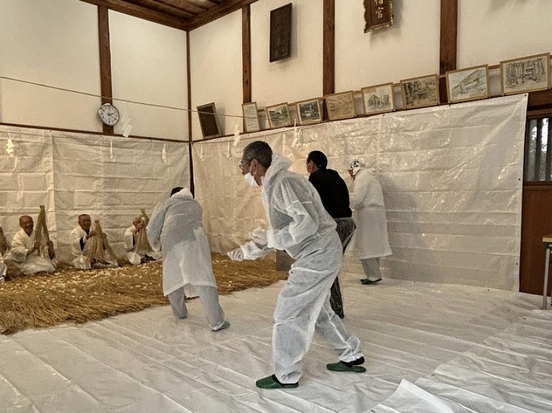 お餅を乾かす合間に、ちぎった餅を白衣の頭人たちに投げつけ、頭人はそれを避ける為、藁をかぶって身を隠すと言う余興も加わります。