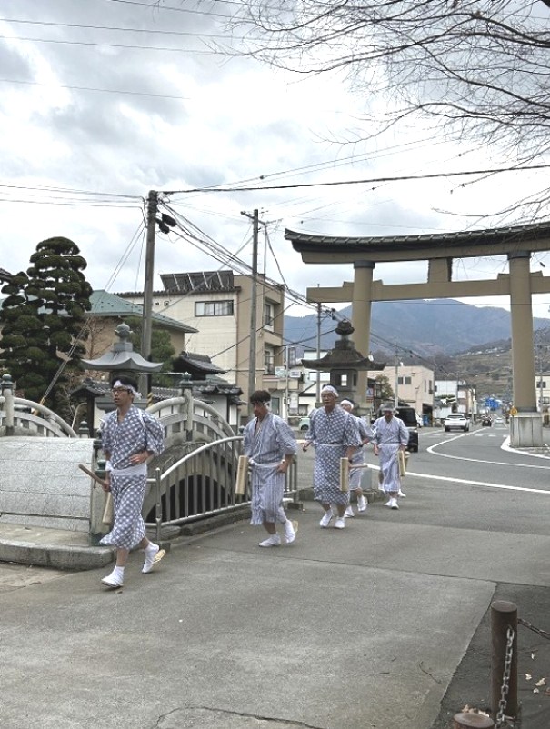 12:40~ 神事と同時進行で、杵を持った餅つき役の人達・トウドは近くの千曲川(平和橋付近)まで行って禊(みそぎ)を行います。行く時は神社北側の道を通ります。