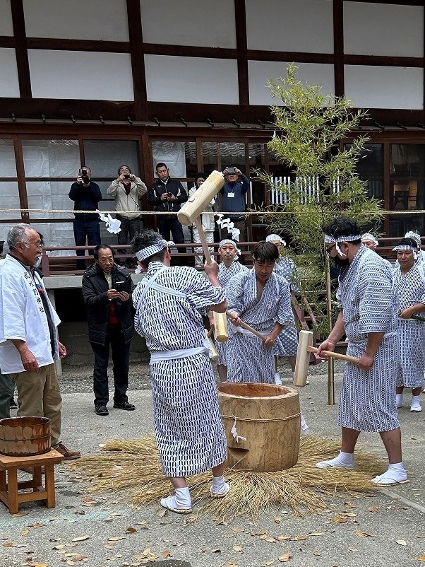 「釜清めの神事」が終わるのを待って、拝殿前では藁を円形に敷いて臼を置き、餅つき役トウドが3人ずつ交代で餅を搗きます。廻りの掛け声に乗って、杵がテンポよく動きます。
