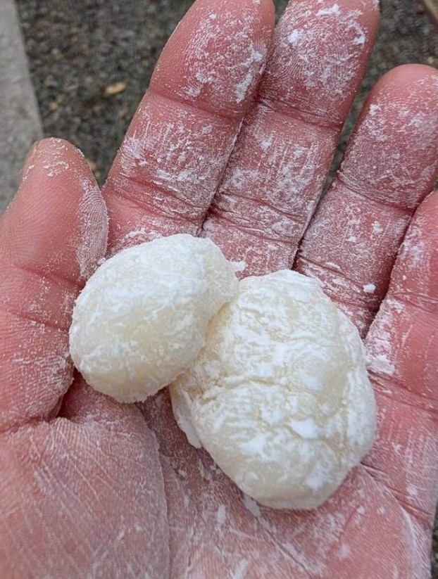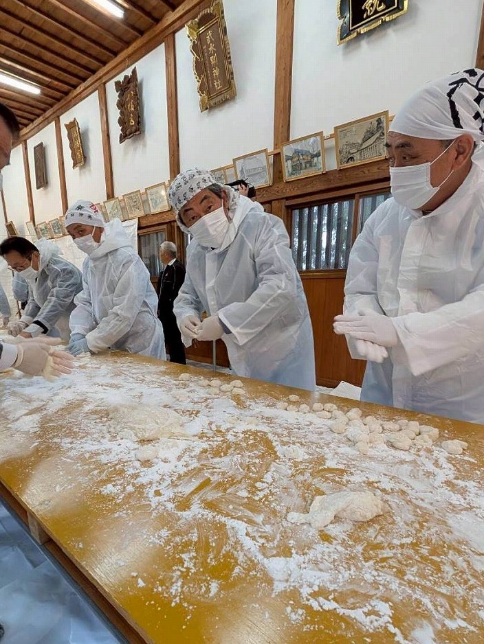 搗いた餅は拝殿横の額殿に運ばれ、総代さん達が片栗粉をまぶし、小さくちぎって丸くして、乾かします。この時一般参拝者にもお振る舞いがあります。