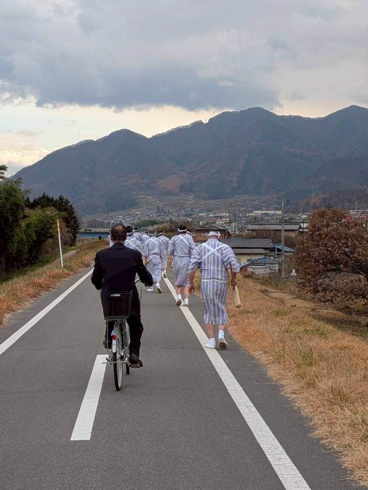 12:40~ 神事と同時進行で、杵を持った餅つき役の人達・トウドは近くの千曲川(平和橋付近)まで行って禊(みそぎ)を行います。行く時は神社北側の道を通ります。