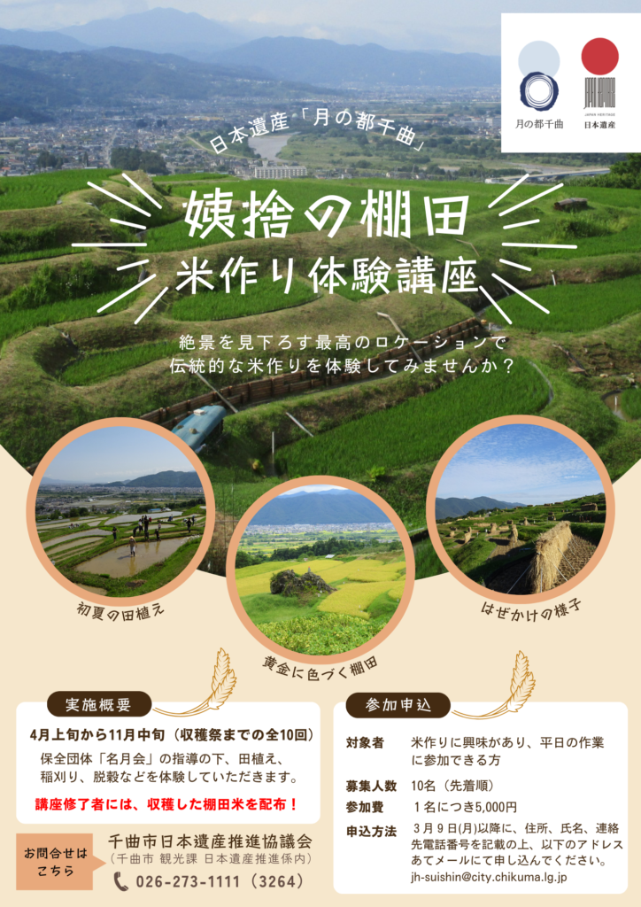 日本遺産「月の都千曲」の構成文化財でもある姨捨の棚田で、米作り体験講座を開催します。